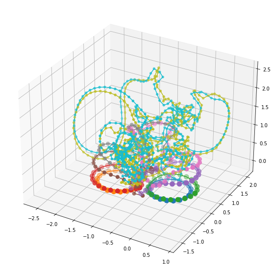 After a pair of segments passing the reconnecting criteria is found, reconnection commences. This involves an indexing nightmare of connecting the correct segments together and creating the updated position, thickness, and circulation vectors in the correct orientation. Failure of indexing and/or the reconnection criterion results in a jumbled mess shown above.